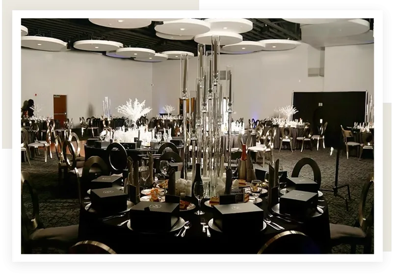 The Executive Package is designed for private, non-wedding events, such as corporate dinners, awards ceremonies, company holidayparties, fundraisers, charity events, retirement dinners, birthdays, and baby/bridal showers. Tailored to provide an exceptional experience for all types of gatherings, this package offers a sophisticated setting with carefully curated amenities. Please note, the Executive Package does not include all-day access, the use of the Bridal & Groom Suite, terrace or other wedding-related features.