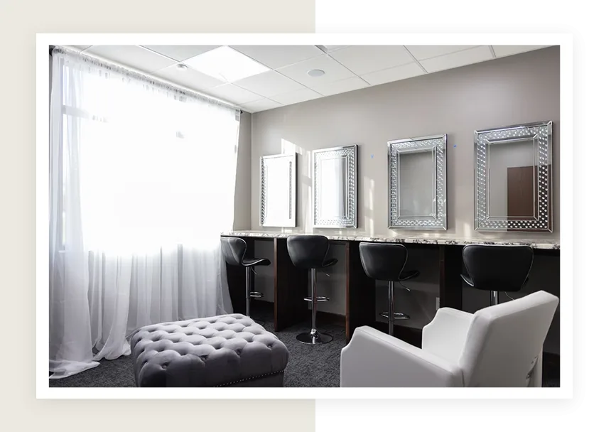 The bridal suite is a luxurious haven designed for ultimate comfort and style. A full vanity stretches across one wall, complete with five elegant makeup stools, offering plenty of space for bridesmaids and the bride herself to prepare in style. The room’s centerpiece is a stunning full length mirror, framed beautifully to reflect the space’s natural light, perfect for those final touches.
